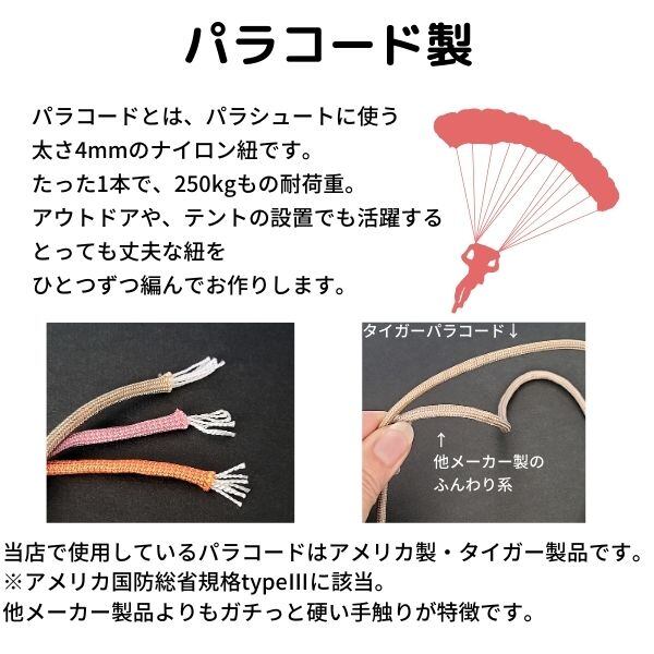 パラコードとは、パラシュート のために作られたもので、1本で250kgもの耐荷重がある、軽量なナイロン紐です。